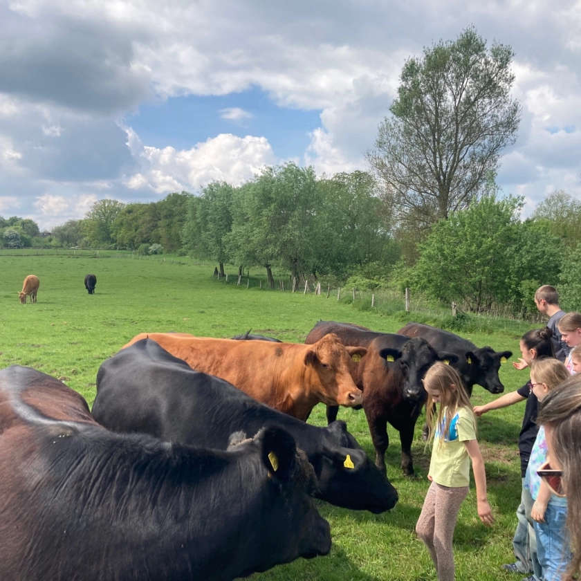 Die abwechslungsreich und aktivierend gestaltete 2,5-stündige Bildungseinheit nimmt die Teilnehmenden mit auf die Rinderweide eines Biobetriebs. Dort tauchen sie altersgerecht ein in die Themen Biodiversität, Bodenfruchtbarkeit, Kreisläufe, Tierwohl und Preisgestaltungen.