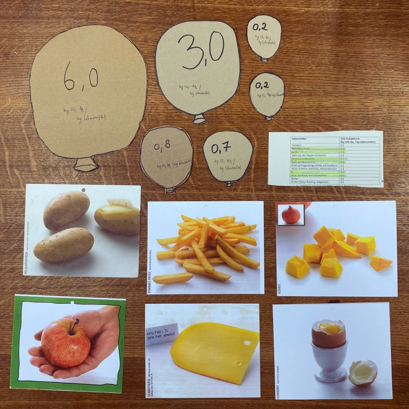 Aufgabe: Ordnet jedem Lebensmittel einen Luftballon zu – je größer der Luftballon, desto mehr Treibhausgase verursacht dieses Lebensmittel.