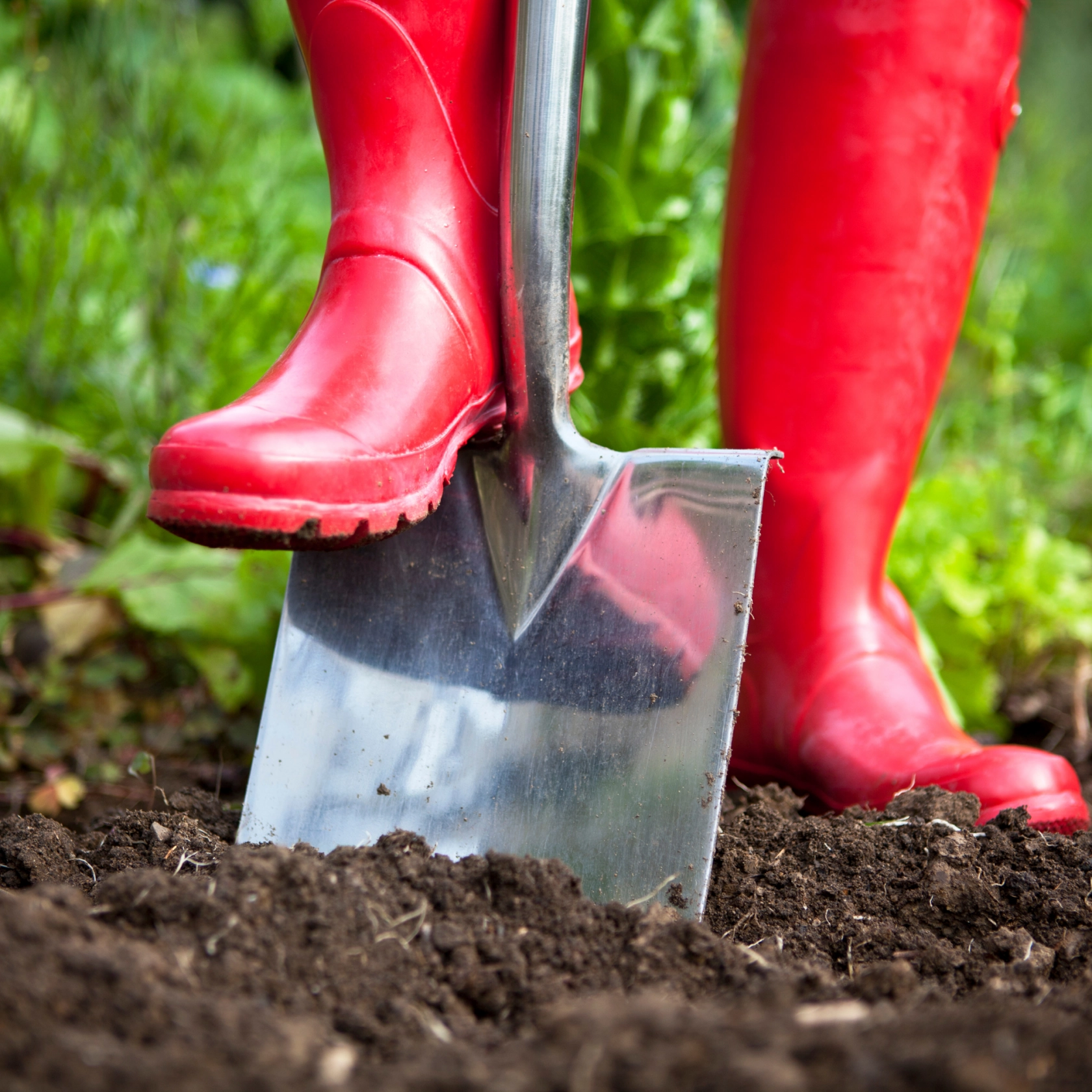 1. Boden entnehmen: Mit einem Spaten wird eine Bodenprobe aus dem Weideland herausgelöst.